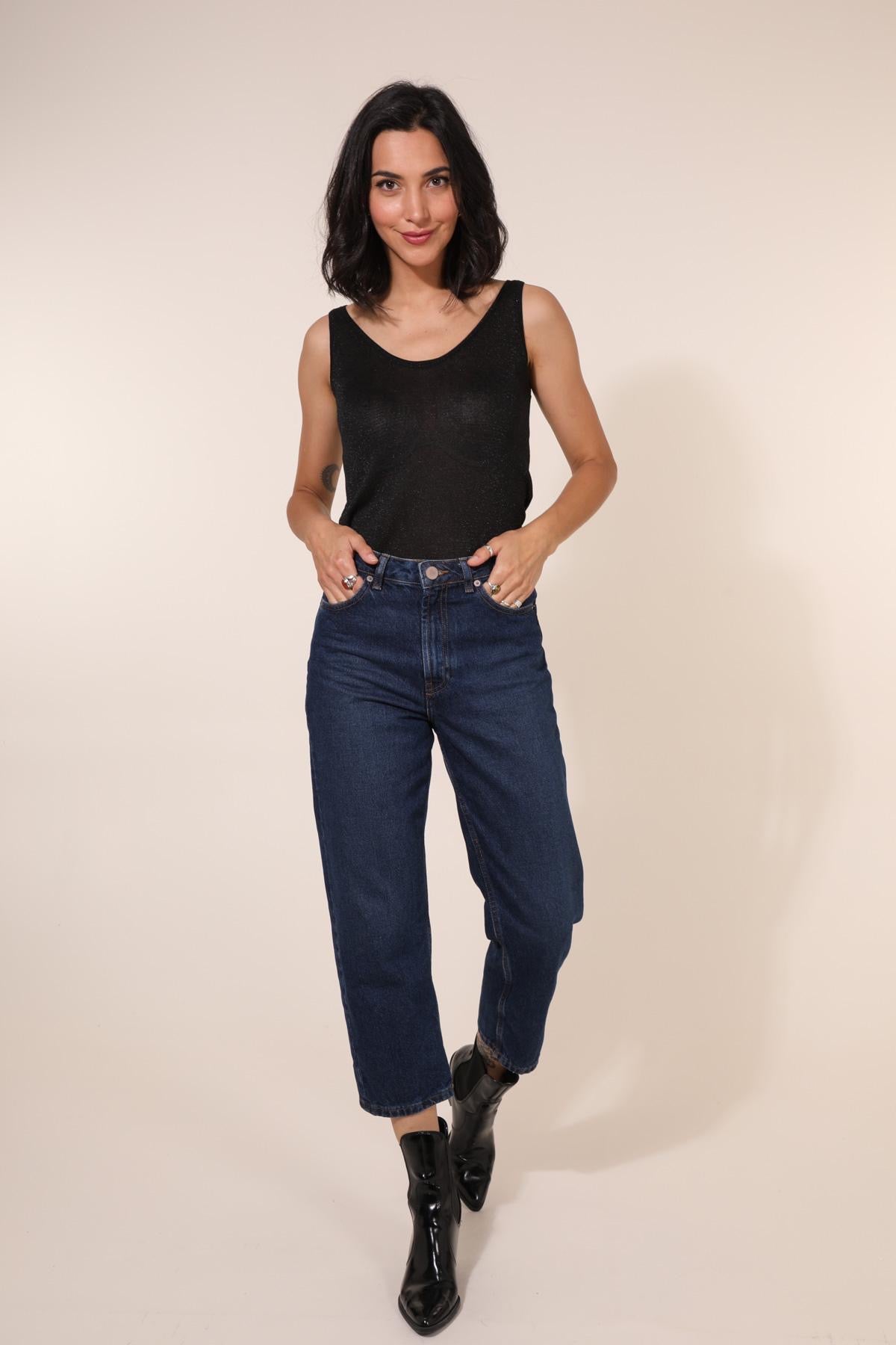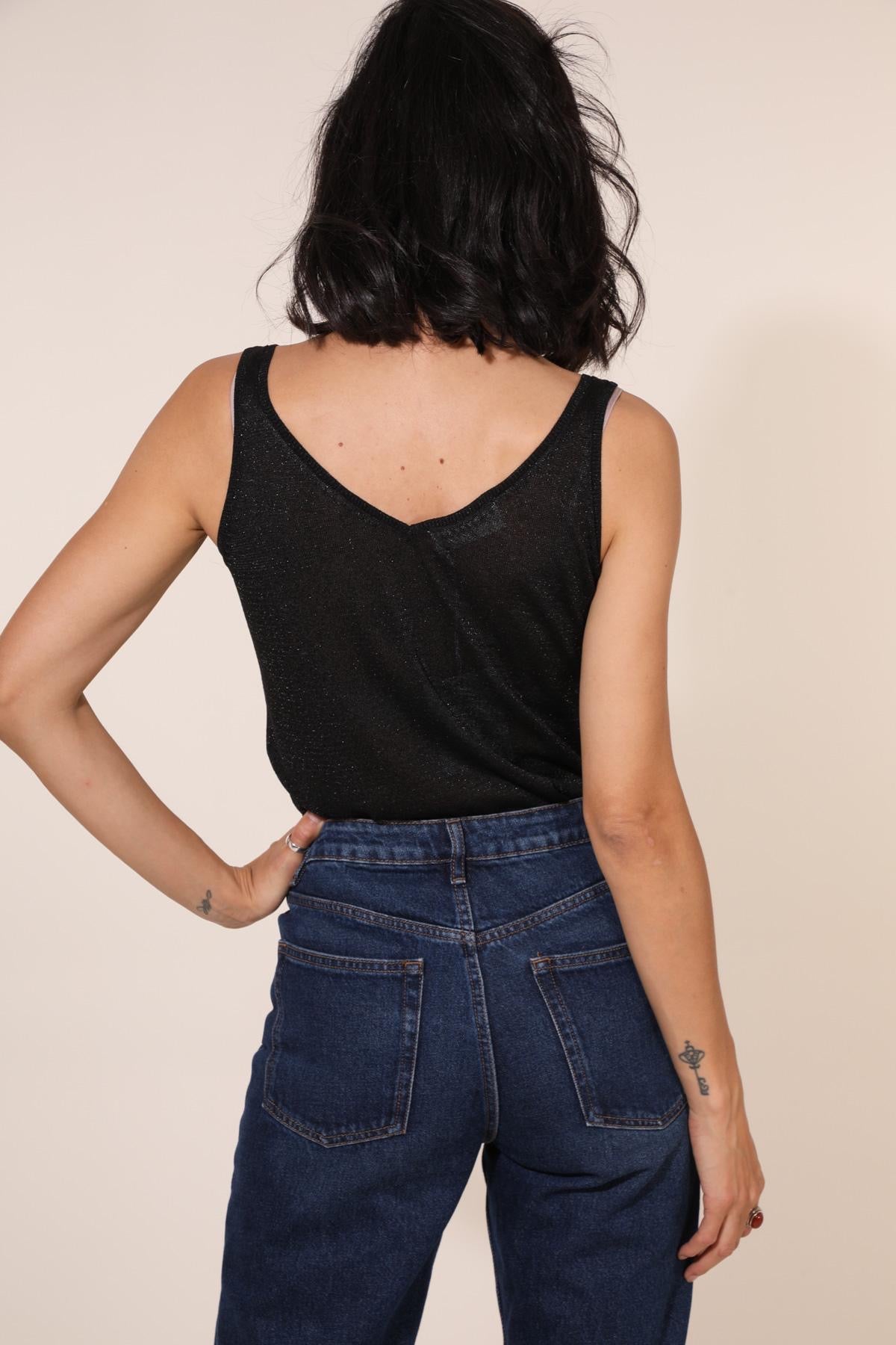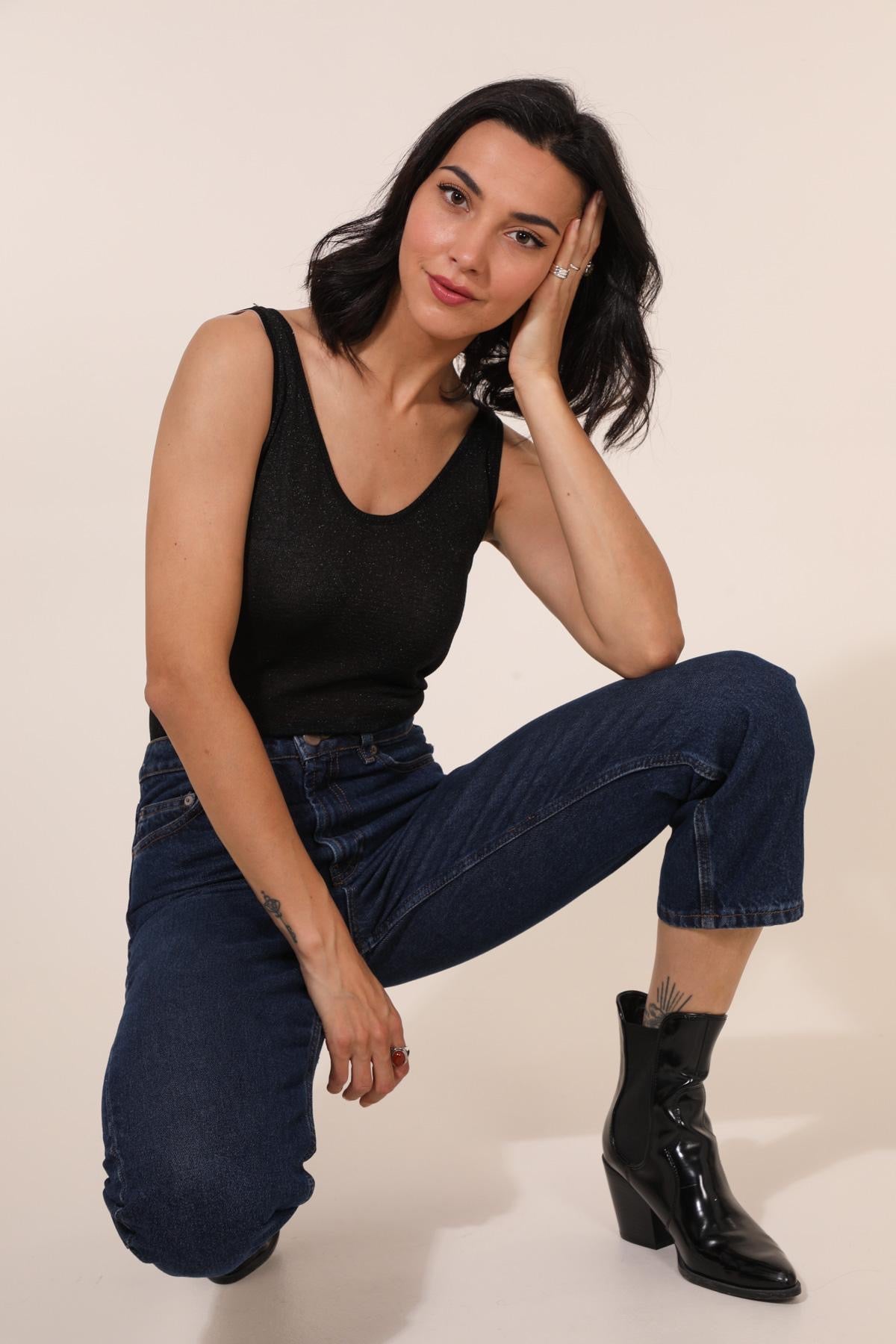 Débardeur sans manches à encolure ronde. Coupe droite avec tissu légèrement scintillant pour une touche élégante et discrète. Finitions en bord-côte ton sur ton pour un look soigné.