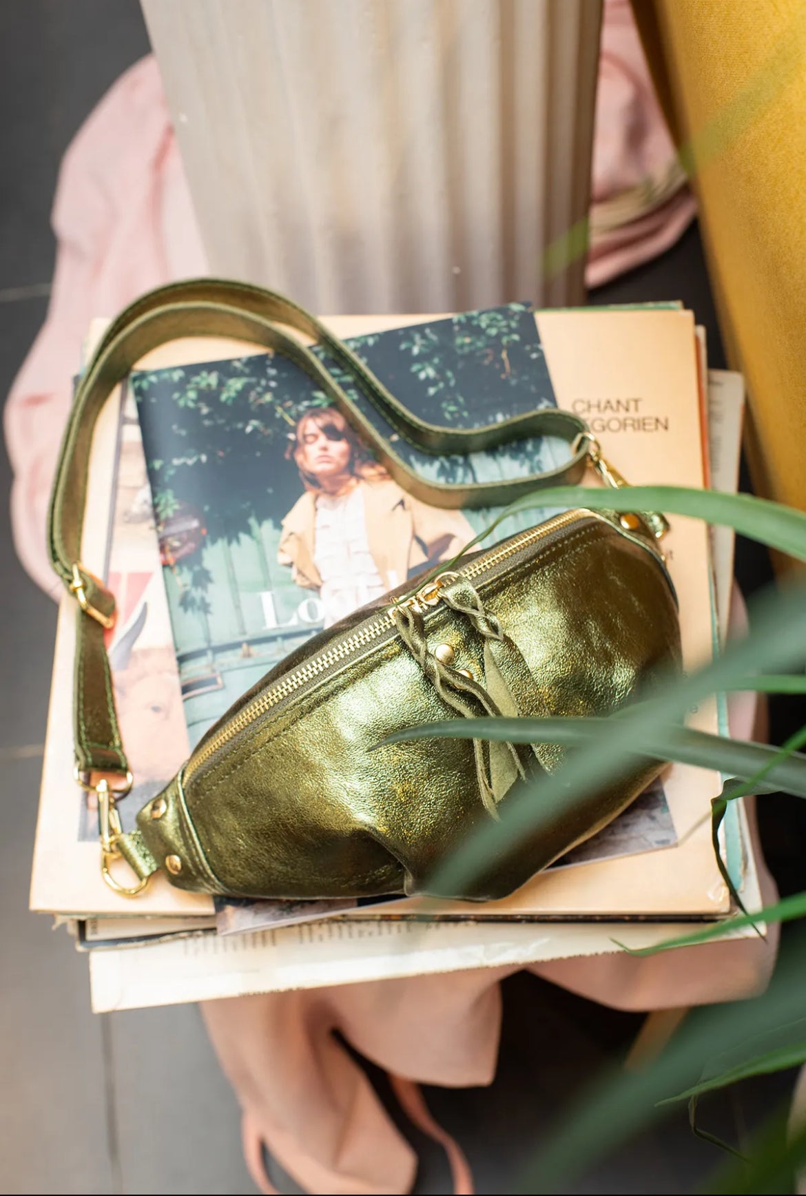 Sac banane en cuir souple métallisé kaki, au look casual chic. Pratique et stylée, cette banane se porte aussi bien en ceinture qu’en travers du buste. Les franges en cuir ajoutent une touche bohème à cette pièce urbaine.
