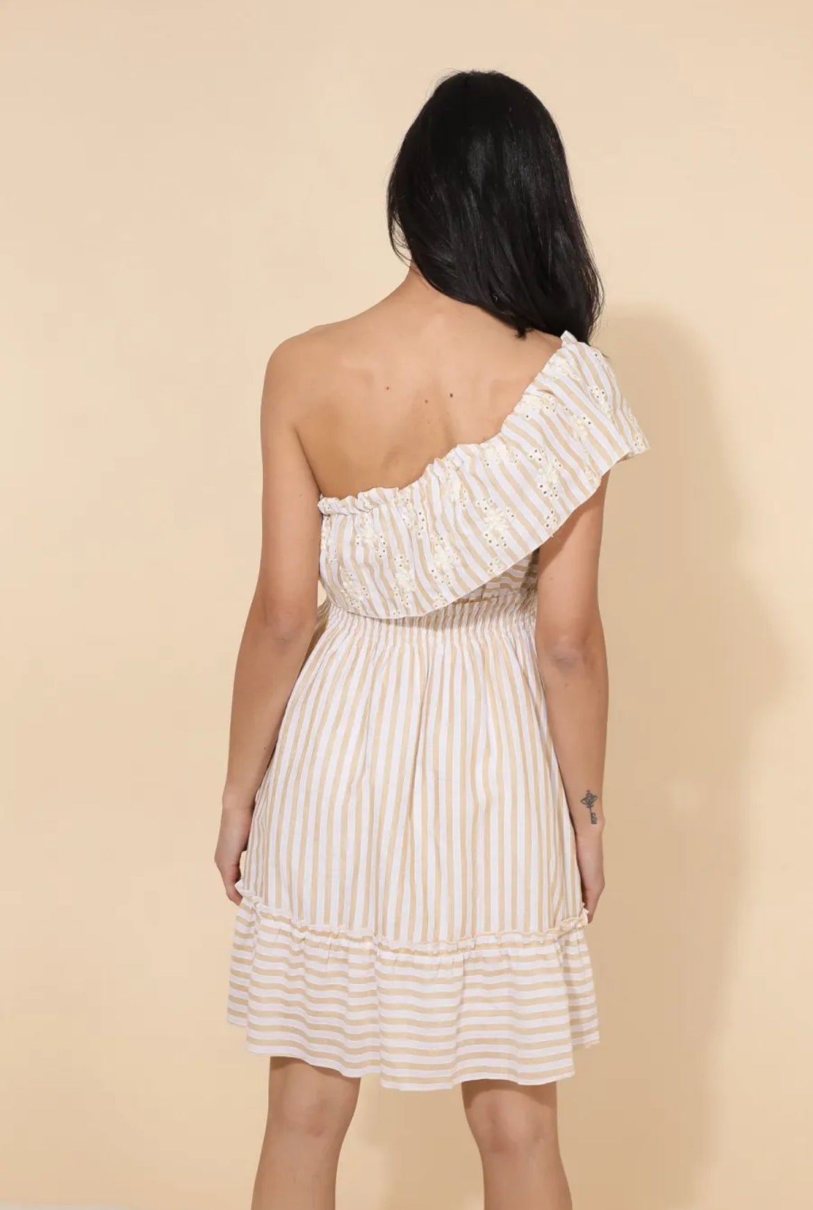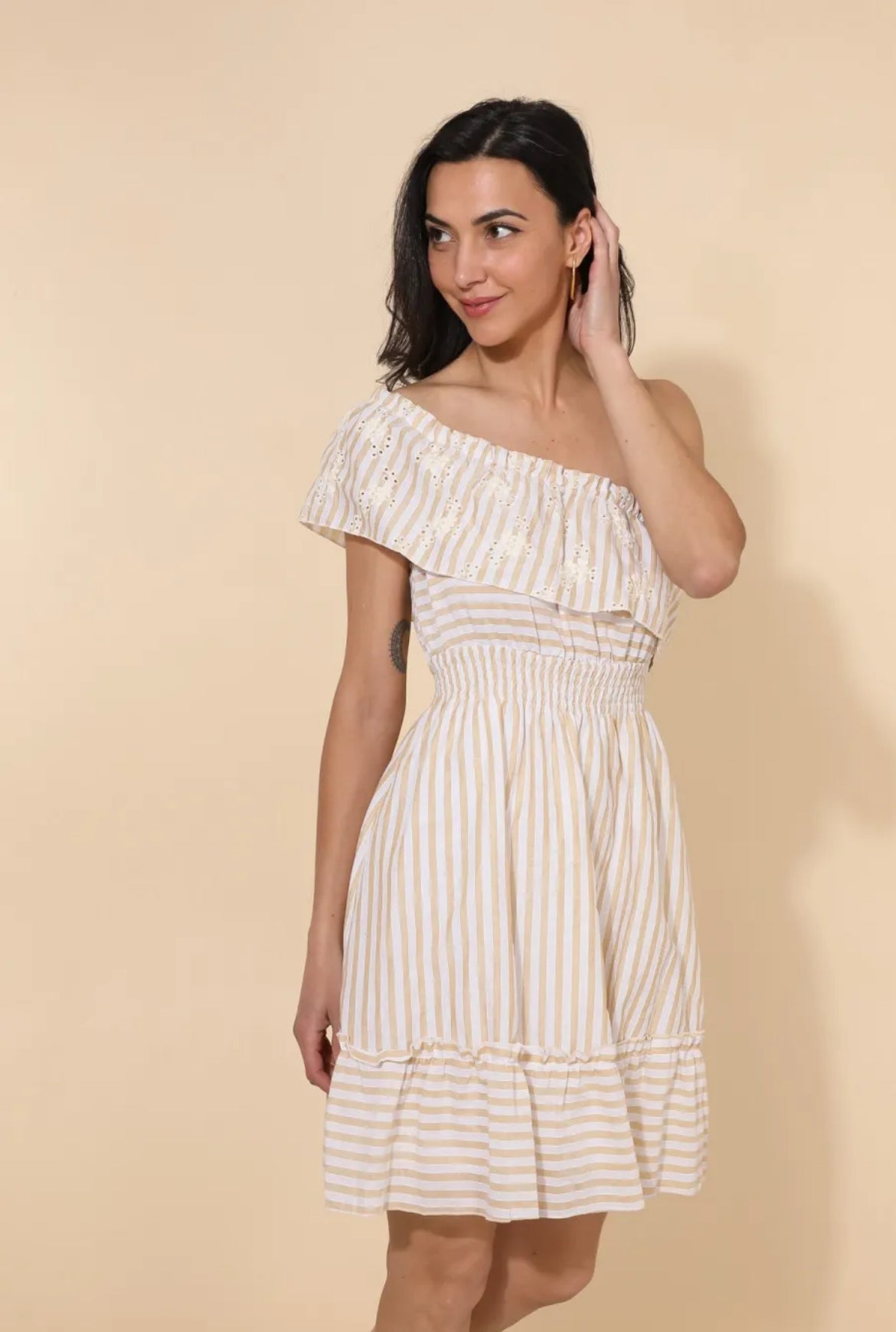 Robe courte asymétrique à rayures beiges et blanches, avec un volant brodé sur l’épaule. Taille marquée et jupe évasée avec un petit volant en bas pour une touche romantique. Parfaite pour un look d’été élégant et léger.