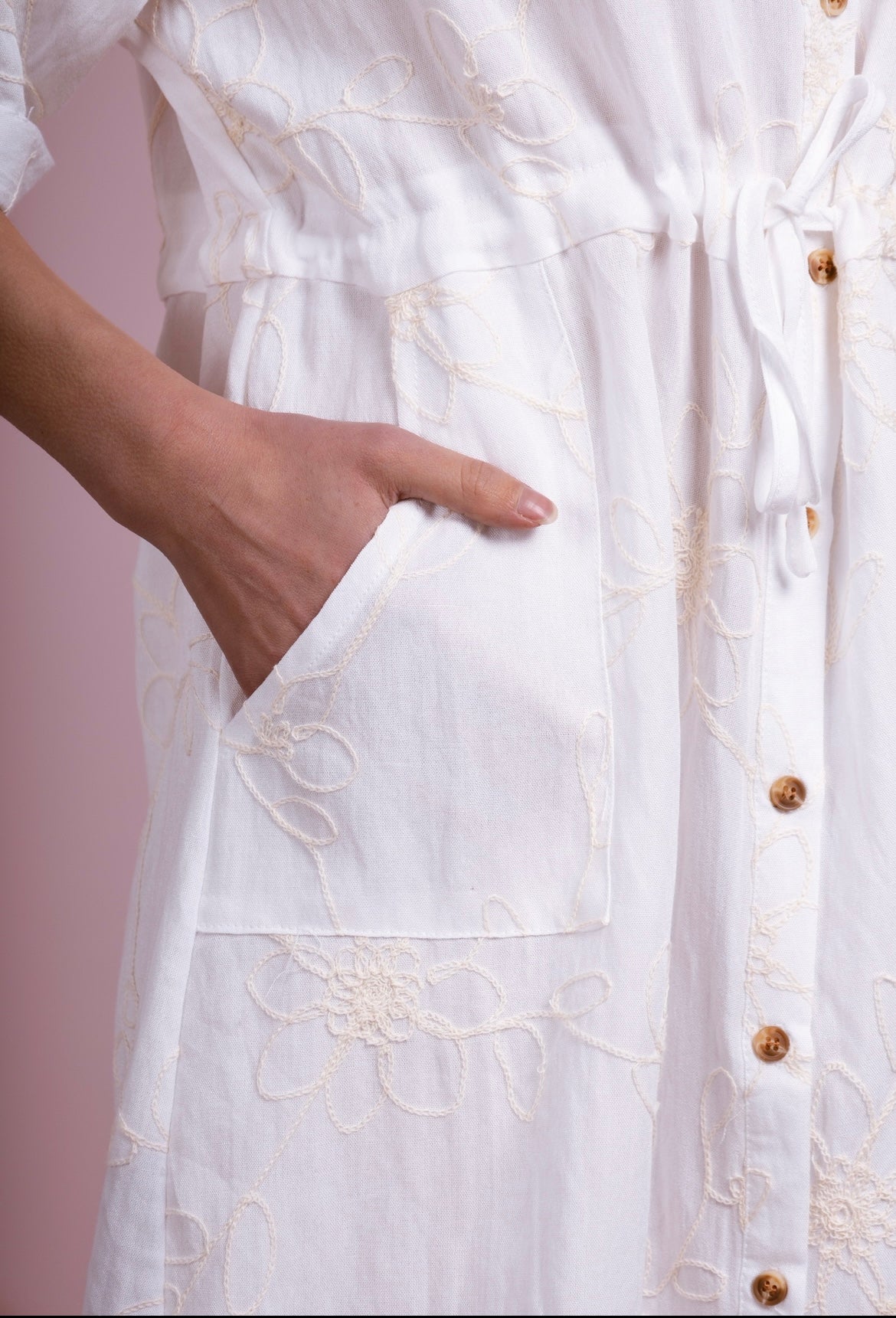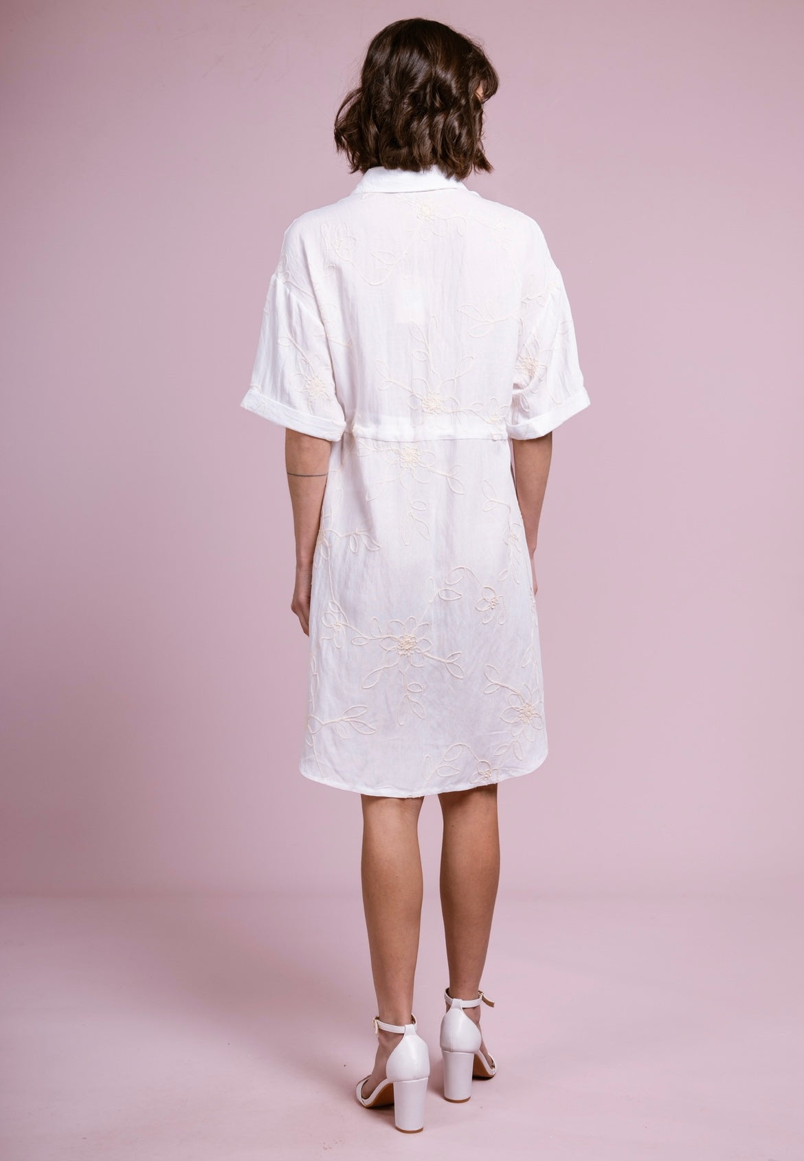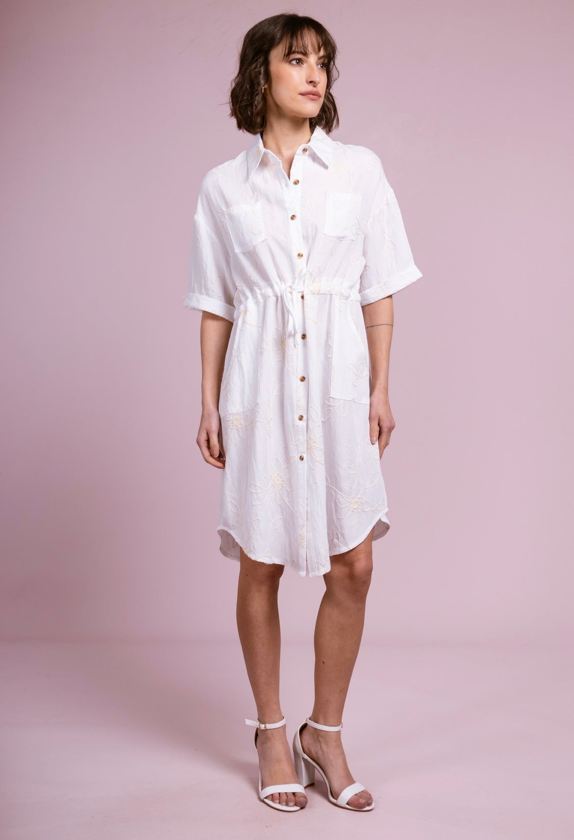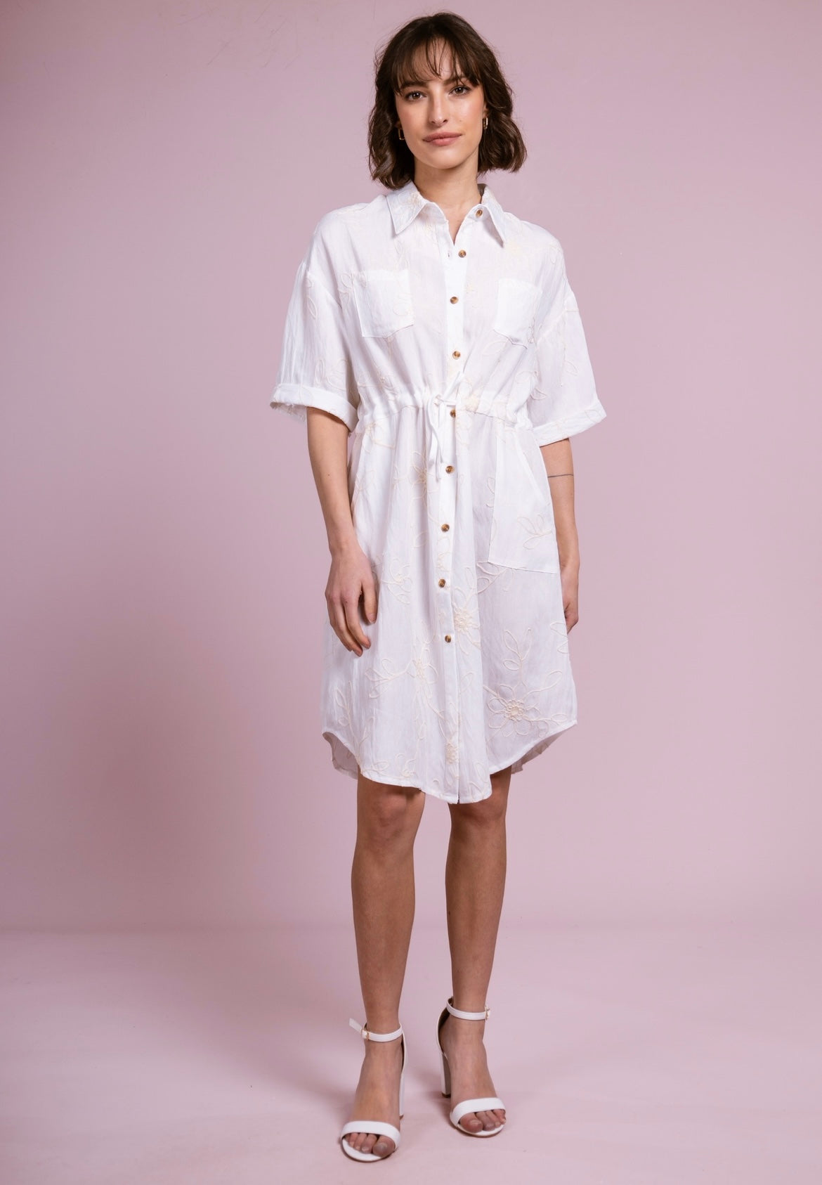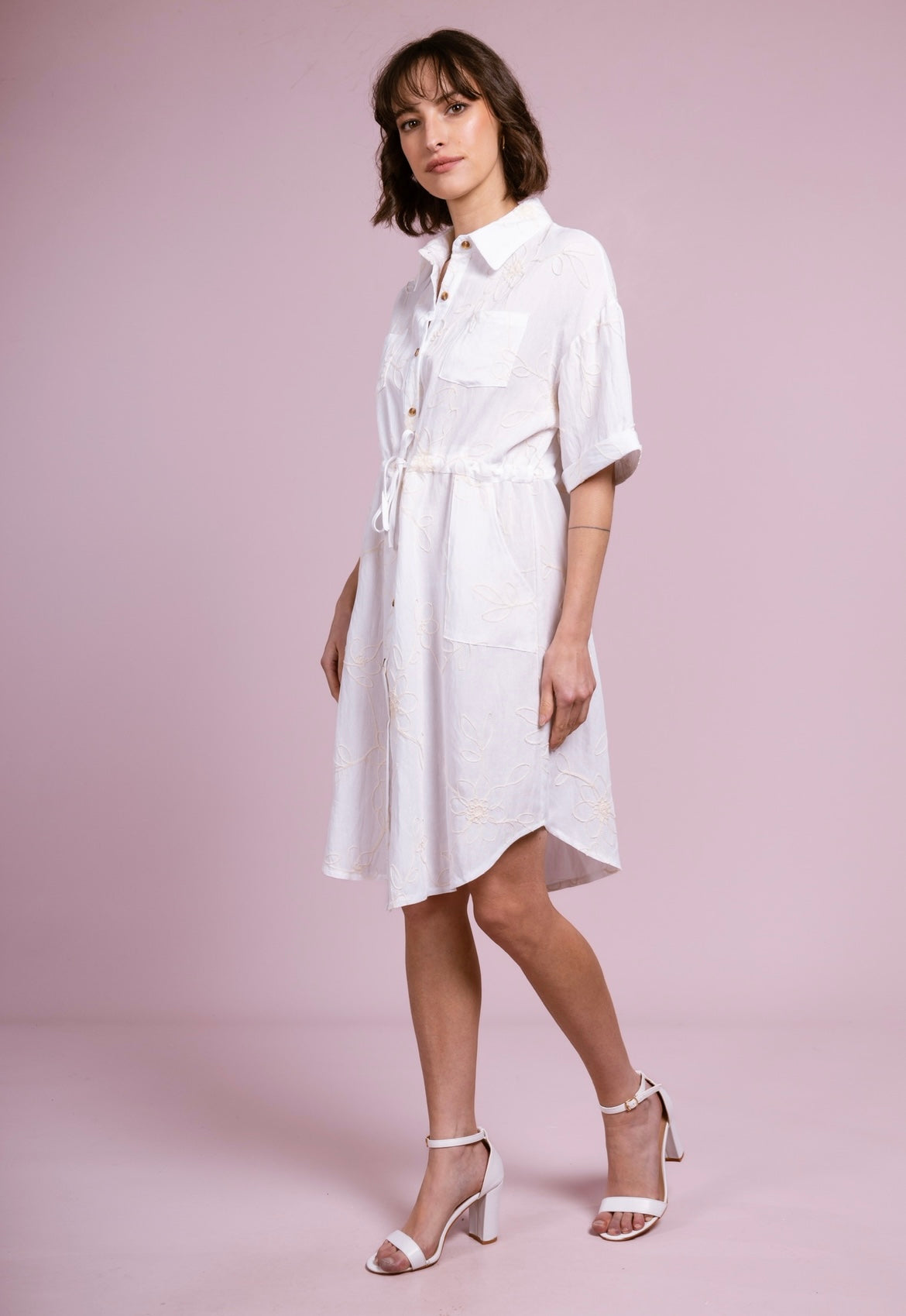 Robe chemise à manches courtes avec taille élastiquée et lien à resserrer. Col classique avec boutonnage sur le devant. Deux poches poitrine plaquées et ourlet arrondi. Motifs brodés ton sur ton pour un effet texturé discret.