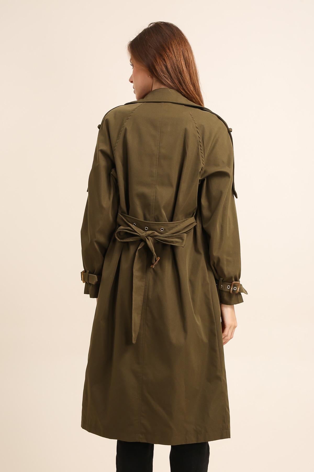 Trench long à col classique et patte boutonnée. Ceinture ton sur ton à nouer à la taille. Fente d’aisance au dos et pattes réglables aux poignets. Fermeture croisée avec boutons devant.