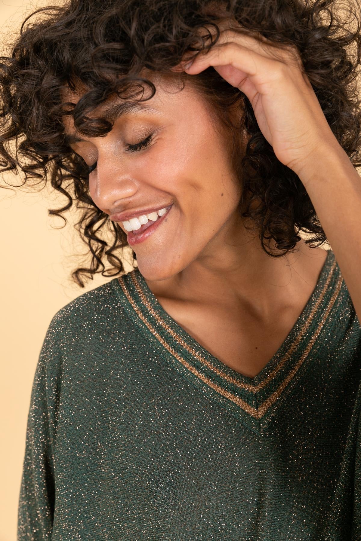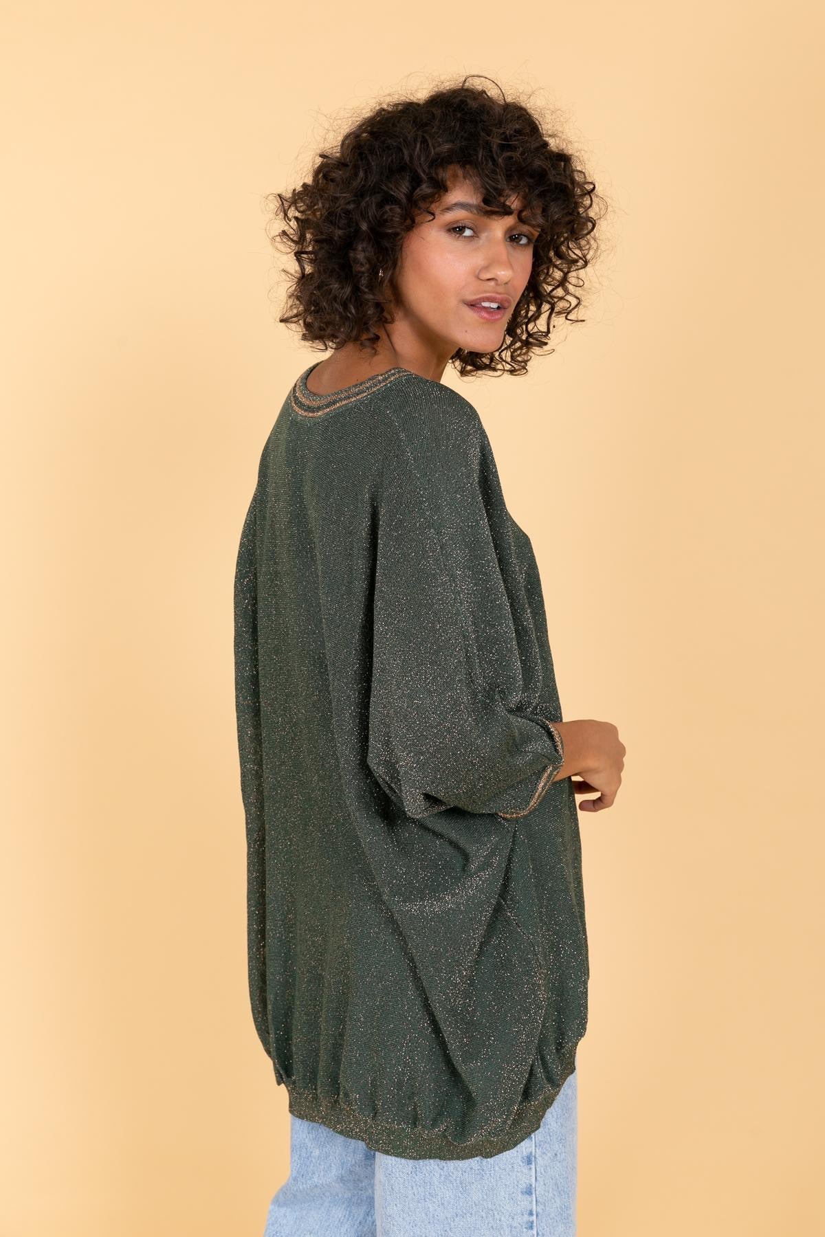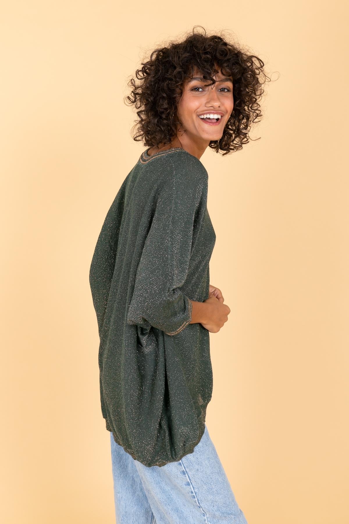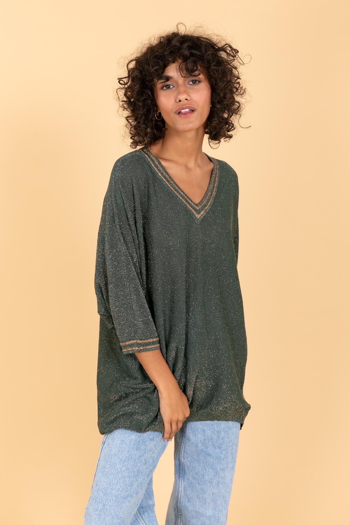 Pull ample en maille fine à effet métallisé, de couleur prune scintillante. Encolure en V soulignée de détails brillants ton sur ton. Manches 3/4 et finition bord-côte à la base pour une touche décontractée et féminine.